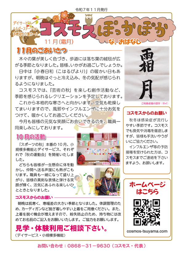 「コスモスぽっかぽかな、おはなし」は、毎月の活動や今後の予定など、ご利用者様のコスモスでの生活を知っていただくため、毎月発行しております。